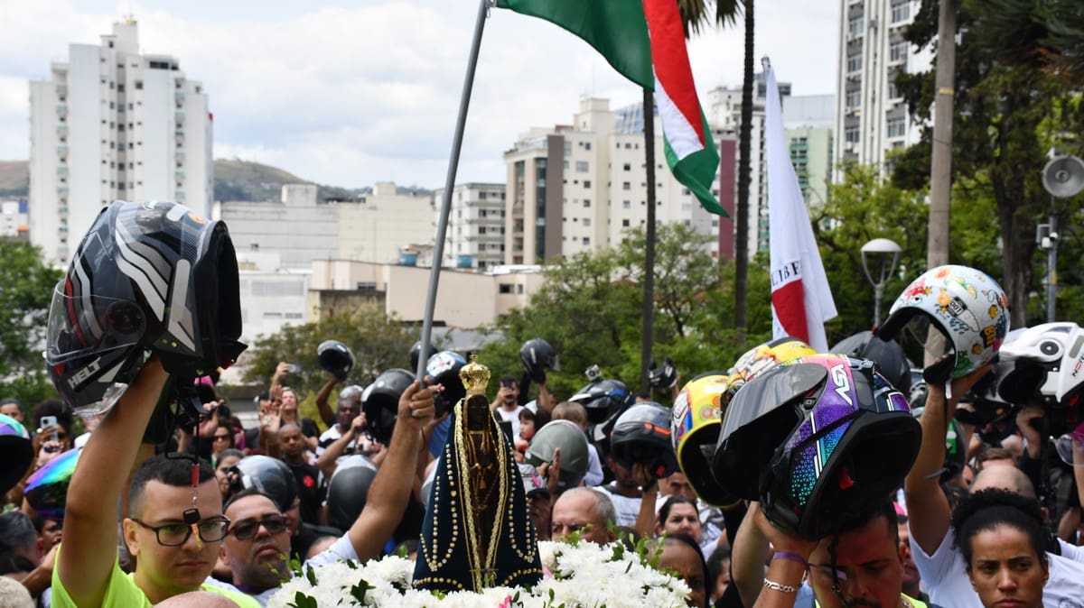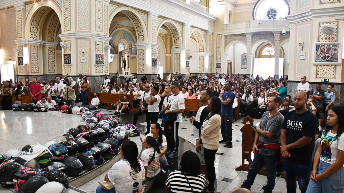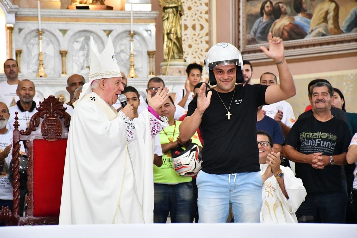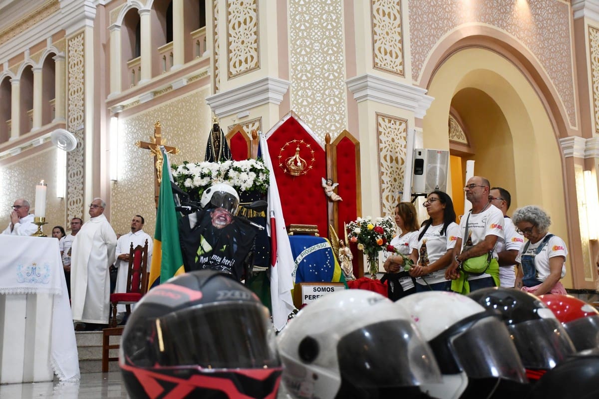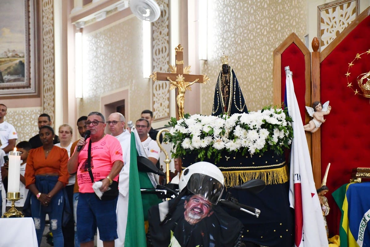 Na moto que entrou com a imagem da Mãe Aparecida também foi feita a homenagem ao motociclista Fausto