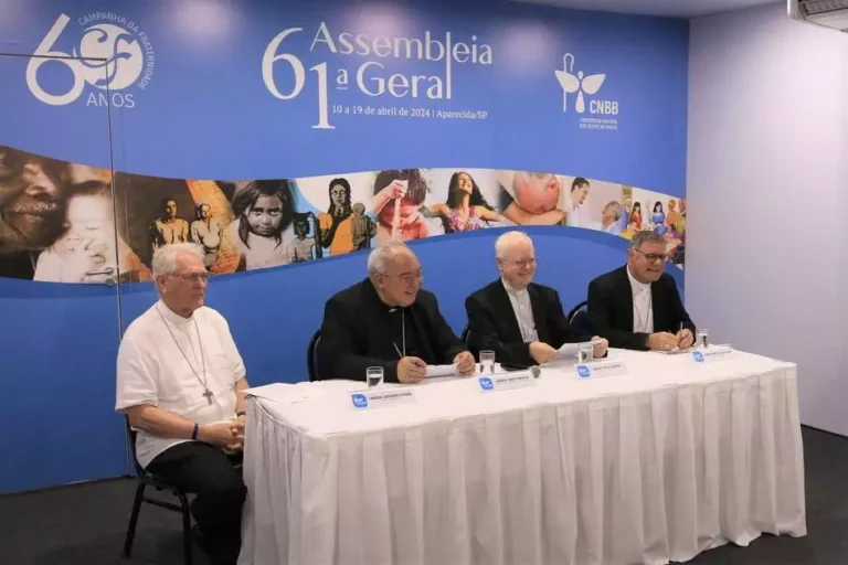 Nesta quarta-feira (17), jornalistas de diversos veículos estiveram reunidos na Coletiva de Imprensa neste oitavo dia da Assembleia Geral dos Bispos do Brasil, no Santuário Nacional de Aparecida. Quatro cardeais estiveram presentes: Dom Leonardo Steiner, Arcebispo de Manaus (AM), Dom Orani Tempesta, Arcebispo do Rio de Janeiro (RJ), Dom Odilo Scherer, Arcebispo de São Paulo (SP) e Dom Paulo Cezar Costa, Arcebispo de Brasília (DF).