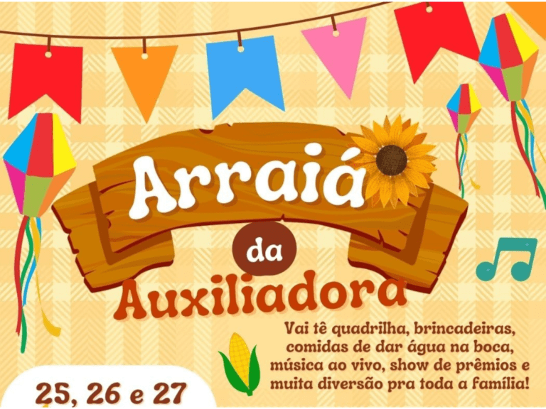 Neste final de semana, nos dias 25, 26 e 27 de julho, a Paróquia Nossa Senhora Auxiliadora realiza seu Arraiá da Auxiliadora. O evento contará com música ao vivo, brincadeiras, comida boa, gente alegre, quadrilha e muita animação.