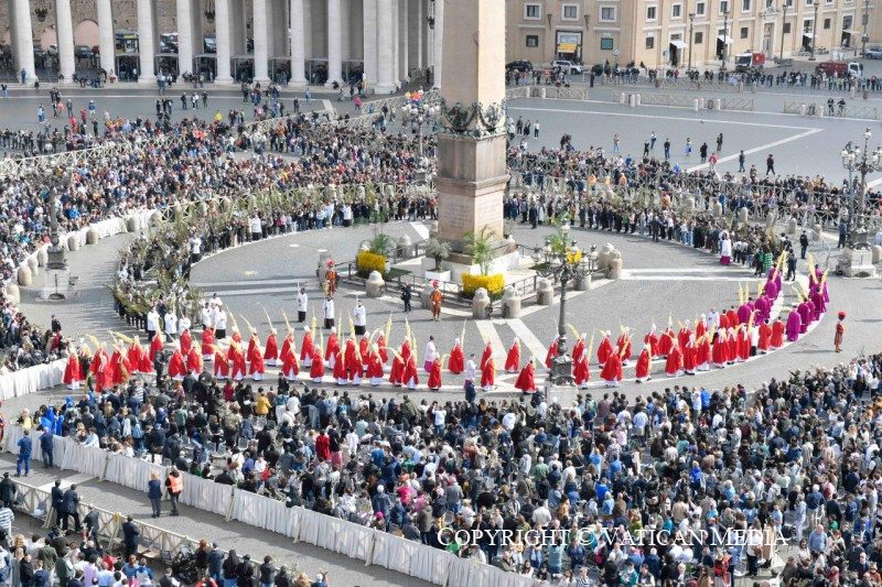 Em uma Praça de São Pedro lotada, cerca de 60 mil fiéis, sob um céu em que os raios de sol se alternavam com as nuvens, a celebração do Domingo de Ramos, presidida pelo Papa Francisco, foi aberta com a comemoração da entrada do Senhor em Jerusalém, da qual se lê o relato do evangelista Marcos, que precedeu a celebração da missa.