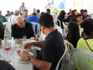 Na sequência, todos representantes das pastorais, movimentos e associações, assim como aqueles que contam com o auxílio destes grupos, se dirigiram à quadra do instituto para o momento de confraternização. “O almoço é uma festa para nos encontrar, primeiro com os assistidos dos nossos muito grupos, pastorais e associações. É bonita essa mistura, que nem dá para diferenciar quem é ajudado e quem ajuda. Isso é legal porque no céu vai ser assim também!”, explicou Padre Geraldo Dondici Vieira, Vigário Episcopal para a Caridade.