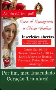 Começou, no último dia 10 de janeiro, o Curso de Consagração à Nossa Senhora, ministrado pelos Arautos do Evangelho de Juiz de Fora. Ainda há vagas para os encontros, realizados às terças-feiras, às 19h30, na Matriz de Nossa Senhora da Conceição. O endereço é Rua Tomé de Souza, 195, em Benfica.