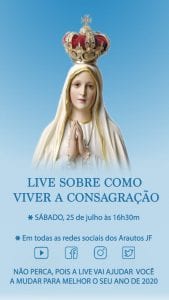 Os Arautos do Evangelho Juiz de Fora promovem, neste sábado, 25 de julho, uma live com ensinamentos sobre como colocar a Consagração a Jesus, pelas mãos de Maria, em prática nestes tempos de pandemia. Em postagem nas redes sociais, a comunidade promete que a explanação ajudará os espectadores a melhorar o ano de 2020, marcado por tantas dificuldades.
