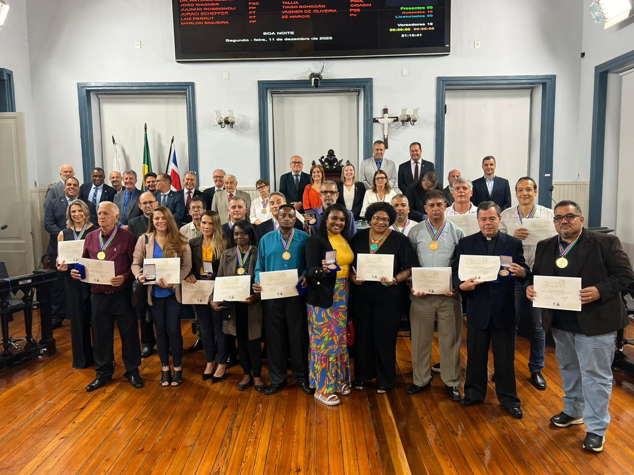 A sessão solene contou com a presença do ex-prefeito Tarcísio Delgado, que dá nome à medalha e foi a primeira personalidade a recebê-la, em 2019.