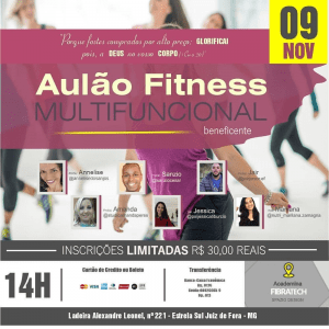 No dia 9 de novembro, no próximo sábado, acontecerá, a partir das 14h, um evento beneficente na Academia Fibratech. Será um aulão multifuncional, um momento de promoção de saúde e bem-estar, com profissionais das áreas de educação física, nutrição, psicologia, dentre outros, buscando promover um ambiente saudável para o físico e que contribua com o espiritual.