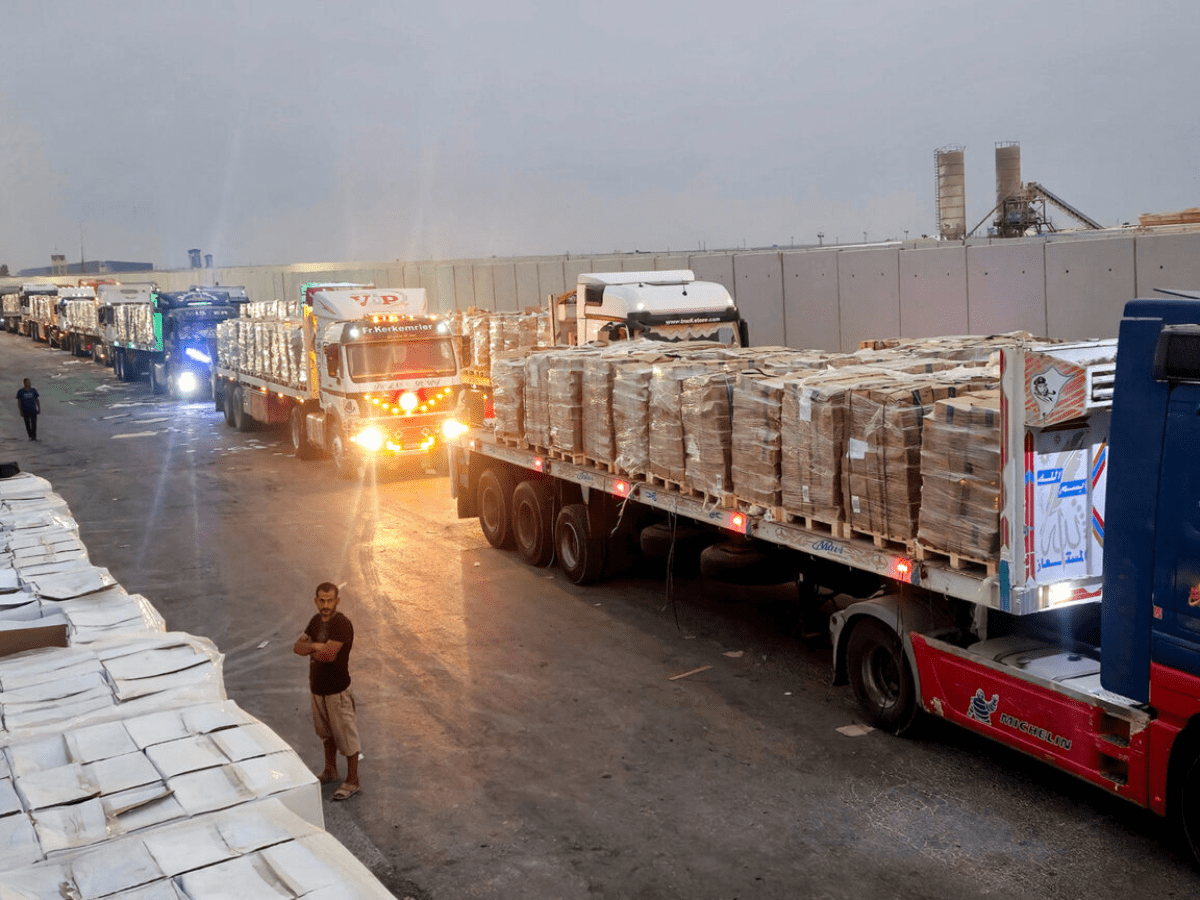 Caminhões de ajuda humanitária com destino a Gaza foram vistos partindo de Rafah, no Egito, na manhã desta quarta-feira, 15, com vários outros enfileirados na área da fronteira.