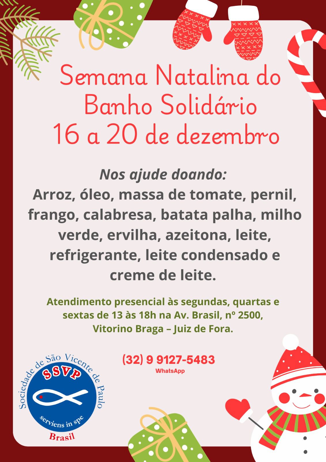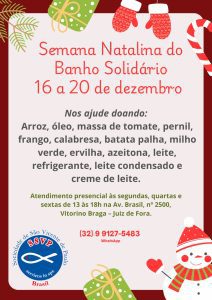 Há também a Semana Natalina do Banho Solidário Vicentino, que será realizada entre os dias 16 e 20 de dezembro, a iniciativa visa a oferecer refeições especiais de Natal às pessoas em situação de rua de Juiz de Fora. Para manter a tradição, os Vicentinos necessitam de doações de alimentos típicos de ceias, como: arroz, óleo, massa de tomate, pernil, frango, calabresa, batata palha, milho, ervilha, azeitona, leite, refrigerante, leite condensado e creme de leite. As doações estão sendo recebidas na Avenida Brasil, 2.500 – Bairro Vitorino Braga, às segundas, quartas e sextas-feiras, das 13h às 18h.