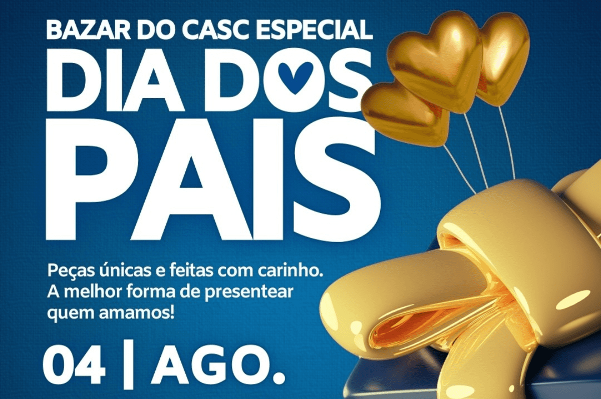 Neste domingo, 4 de agosto, a Paróquia Santa Teresinha, em Juiz de Fora, promoverá o Bazar do CASC Especial de Dia dos Pais. Esta é uma iniciativa do Centro de Aprendizagem Santa Catarina, o CASC, ativo na Paróquia. O evento acontecerá na garagem da Paróquia, das 8h às 11h.