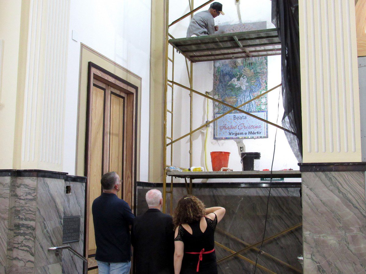 A responsável pelos mosaicos é a artista plástica e mosaicista mineira Denise Arantes. “Foi uma emoção maior que a outra. Depois de Maria Mãe da Igreja, trabalhar a Beata Isabel Cristina, que representa tanta pureza, uma mártir necessária para representar não só os jovens na Igreja, mas também os estudantes, as mulheres, vítimas de tanta violência, foi um presente, de verdade. O mundo precisa dessa santa. Em breve, se Deus quiser, teremos o prazer de estar aqui substituindo aquela palavrinha ‘beata’ por ‘santa’. Já está tudo até com a medida pronta, só aguardando o Papa Francisco anunciar mais uma santa brasileira e, dessa vez, uma jovem que nos ensina muito: apesar da pouca idade, uma entrega a Deus e a Maria que eu não conheço igual”, sublinhou Denise.