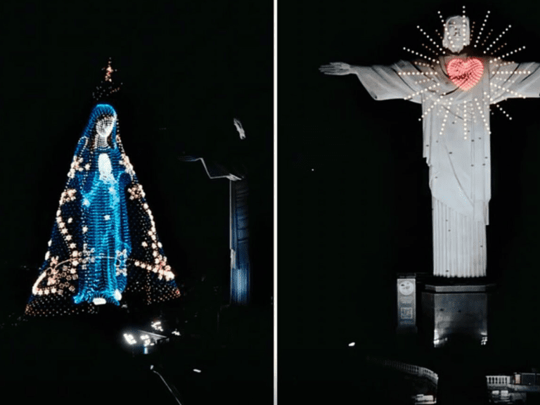 Na noite de sexta-feira, 9, a imagem de Nossa Senhora Aparecida foi projetada ao lado do Cristo Redentor, no alto do Corcovado, por meio de centenas de drones com luzes coordenadas.