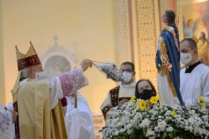 O templo voltou a receber grande número de fiéis em Missa arquidiocesana, sendo tomados todos os cuidados de prevenção contra a Covid-19. Participaram, na ocasião, além de padres e diáconos permanentes, os missionários sinodais e os convidados dos seminaristas.
