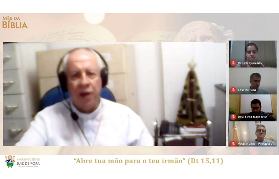 O encontro virtual foi protagonizado pelo Arcebispo Metropolitano, Dom Gil Antônio Moreira, pelo Padre Geraldo Dondici Vieira e pelos Professores Davi Maçaneiro e Eduardo Faria. Dom Gil acolheu os expectadores recordando que naquele dia celebrava-se São Jerônimo, tradutor das Sagradas Escrituras.