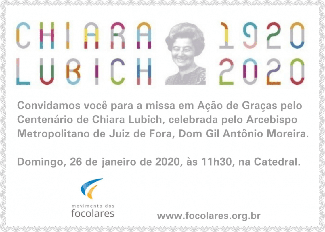 No próximo domingo, 26 de janeiro, às 11h30, a Catedral Metropolitana de Juiz de Fora sedia Missa em Ação de Graças pelo centenário de Chiara Lubich, fundadora do Movimento Focolares. A celebração será presidida pelo Arcebispo Metropolitano, Dom Gil Antônio Moreira.