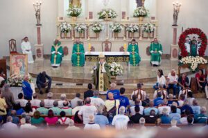 Logo cedo, os fiéis foram acolhidos para o café da manhã na Paróquia São Sebastião, onde foram recebidos pelo Pe. Rafael Coelho do Nascimento e pelo Diácono Celso Aparecido Rodrigues Melo, diretor espiritual do TH. Em seguida, saíram em procissão com o ícone de Maria, Mãe da Igreja até o Santuário Arquidiocesano São Miguel e Almas.