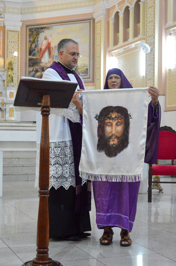 Uma personagem que sempre tem destaque durante a cerimônia é Verônica, mulher que, durante a Via-Crucis, aproxima-se de Jesus e enxuga seu rosto ensanguentado com uma toalha, na qual ficou estampada Sua Sagrada Face. Neste ano, a interpretação do “Canto de Verônica” foi feita por Terezinha das Graças Verazzani. Paroquiana muito atuante na Catedral, esta foi a primeira vez que ela entoou o cântico. “Eu me senti muito emocionada… eu nunca imaginaria fazer Verônica um dia. E fiquei muito feliz, porque eu me senti mais perto de Cristo”, confidenciou a fiel.