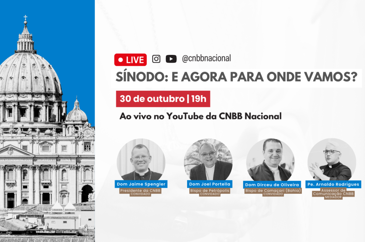 Para refletir sobre estas e outras perguntas, a Conferência Nacional dos Bispos do Brasil (CNBB) promove na próxima quarta-feira, às 19h, a live: “Sínodo: e agora para onde vamos?”. O mediador da live será o assessor de Comunicação da CNBB e professor da PUC Rio, padre Arnaldo Rodrigues. A live será transmitida no canal de Youtube e no Instagram da CNBB.