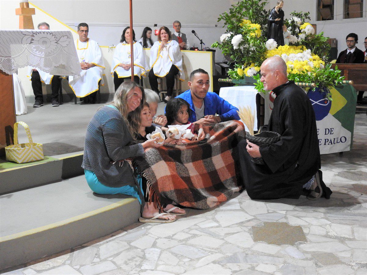 A alegria e o fervor da comunidade foram evidenciados diversas vezes durante a Santa Missa, seja através dos sorrisos estampados nos rostos, na força das orações, na disposição dos presentes e nas homenagens. Ao final da celebração, uma cena que certamente ocorreu na vida do pai da caridade foi apresentada.