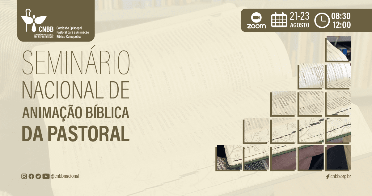 A Comissão para a Animação Bíblico-Catequética da Conferência Nacional dos Bispos do Brasil (CNBB) promoverá de 21 a 23 de agosto, de forma online, o Seminário Nacional da Animação Bíblica da Pastoral (ABP), com o objetivo de envolver os diversos representantes diocesanos e oferecer uma reflexão a respeito do que é a ABP e caminhos para sua implementação. Participam bispos, padres e cristãos leigos envolvidos no trabalho de Animação Bíblica da Pastoral nos regionais e dioceses.