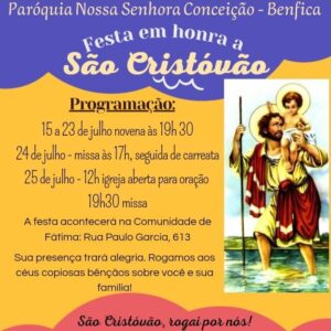 Na Zona Norte de Juiz de Fora, a Comunidade São Cristóvão, do Bairro Jardim de Fátima, inicia nesta sexta-feira (15) festa em honra a seu padroeiro, aquele que é invocado como Padroeiro dos barqueiros, peregrinos, viajantes e motoristas.