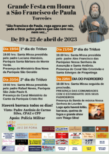 O tríduo irá até o dia 21, com Missas todos os dias às 19h, presididas por padres convidados. A festa do Padroeiro será recordada no sábado (22), a partir das 18h, quando haverá Celebração festiva, seguida de procissão e atividades sociais.