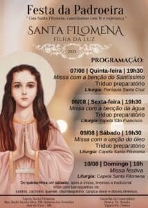 Já o domingo (10) contará com a Missa festiva celebrada às 10h. A Capela Santa Filomena fica na Rua Aladir Soares Silva, 136 – Bairro Quintas das Avenidas.