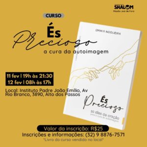 O curso será baseado no livro de mesmo nome, de autoria de Emmir Nogueira. “Inspirado por Is 43,4, que diz ‘Porque és precioso aos meus olhos, eu te aprecio e te amo! Troco reinos por Ti!’, este livro é um itinerário de 10 dias de oração para a cura da autoimagem. A obra é um percurso de fé, amor e confiança em Deus que vai transformar a sua autoimagem pela ação da graça divina e da Palavra”, informa a descrição da obra no site da Livraria Shalom.