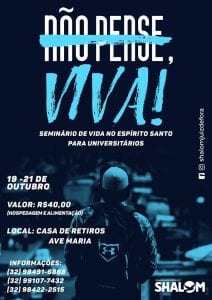 A Comunidade Shalom de Juiz de Fora realiza, pela primeira vez, um Seminário de Vida no Espírito Santo para jovens em forma de retiro. O encontro será neste final de semana, dos dias 19 a 21 de outubro, na Casa de Retiros Ave-Maria.