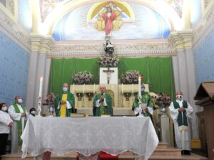A Eucaristia foi concelebrada pelos padres Gleydson Pimenta de Faria, Administrador da Paróquia Nossa Senhora do Rosário de Bocaina de Minas (MG), e Luciano Atanázio, futuro Administrador da Paróquia Santa Bárbara, de Santa Bárbara do Monte Verde (MG). O Diácono Sebastião Maurício da Silva serviu ao Altar.