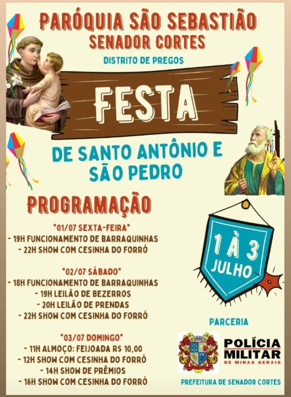 No Distrito de Pregos, em Senador Cortes (MG), começa nesta sexta-feira (1º) a Festa de Santo Antônio e São Pedro. A programação, que vai até domingo (3), inclui funcionamento de barraquinhas, apresentações musicais, leilão de bezerros e prendas e venda de almoço. Confira, na imagem abaixo, os horários das atividades: