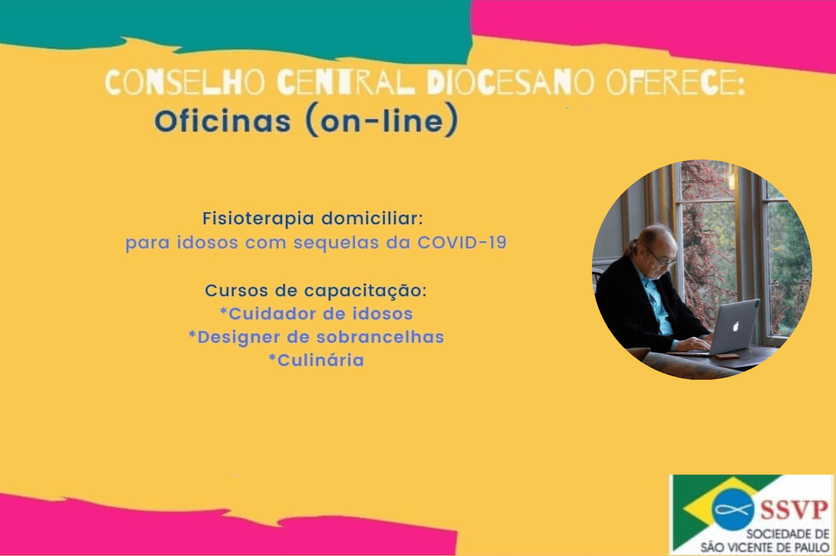 O Conselho Central Diocesano (CCD) da Sociedade de São Vicente de Paulo (SSVP) oferece oficinas online em Memória, Relaxamento e Ginástica, além de fisioterapia domiciliar para idosos com sequelas da Covid-19, e ainda cursos de capacitação em Designer de Sobrancelhas, Cuidador de Idosos e Culinária.
