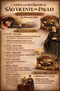 A Arquidiocese de Juiz de Fora viveu, na última terça-feira, 14 de abril, um momento de profunda espiritualidade com a acolhida das relíquias de São Vicente de Paulo, acompanhadas de uma réplica de seu corpo em tamanho natural. A peregrinação integra a programação internacional iniciada no Brasil em 2024, com previsão de seguir até março de 2028, sob o tema “Corações Ardentes, Pés a Caminho na Caridade”.