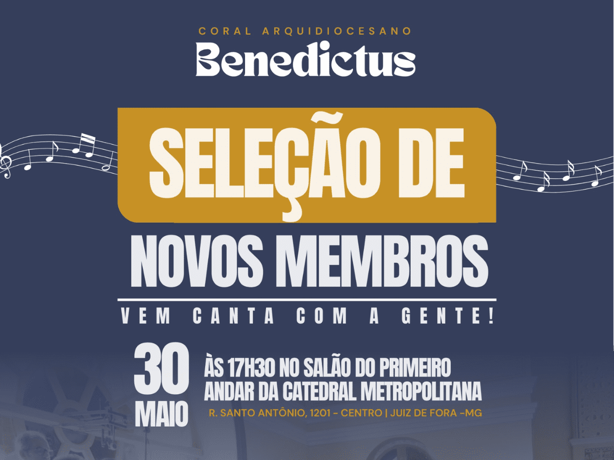 Na próxima sexta-feira, 30 de maio, às 17h15, o Coral Benedictus realizará uma seleção para novos integrantes, no salão do primeiro andar da Catedral Metropolitana de Juiz de Fora.