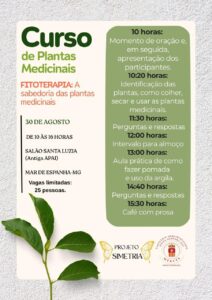 A Paróquia Santuário Nossa Senhora das Mercês, em Mar de Espanha (MG), promove neste sábado, dia 30 de agosto, o Curso de Plantas Medicinais – Fitoterapia: a sabedoria das plantas medicinais, em parceria com o Projeto Simetrias. A formação acontecerá no Salão Santa Luzia (antiga Apad), das 10h às 16h, reunindo momentos de oração, aprendizado e prática.