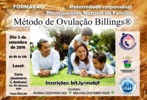 No próximo domingo (2) acontecerá a formação “Planejamento Natural da Família – Paternidade responsável” no prédio da Cúria Metropolitana. O evento, promovido pela Pastoral Familiar Arquidiocesana, tem como objetivo divulgar o Método de Ovulação Billings (MOB) e ensiná-lo, na prática, àqueles que já o conhecem.
