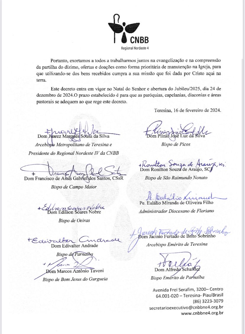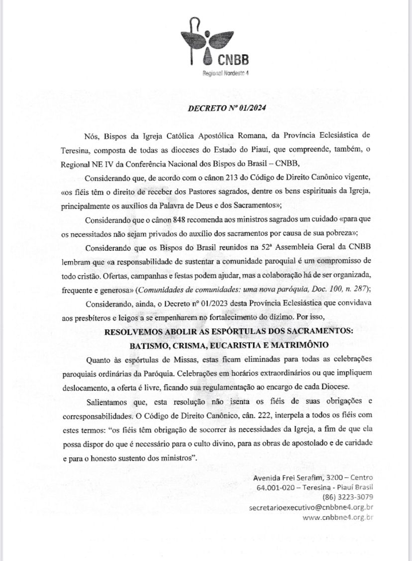 A Conferência Nacional dos Bispos do Brasil (CNBB) Regional Nordeste 4, através do Decreto nº 01/2024, resolveu abolir as taxas relacionadas a espórtulas dos sacramentos (batismo, crisma, eucaristia e matrimônio). A decisão partiu dos bispos durante o Conselho Episcopal Regional (CONSER), que aconteceu no Centro de Treinamento Arquidiocesano, nos dias 15 e 16 de fevereiro.
