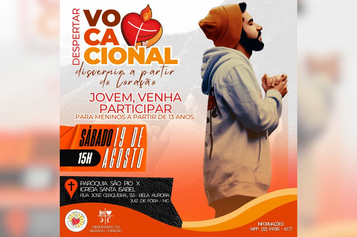 A Congregação dos Missionários do Sagrado Coração (MSC) promove no próximo sábado, 19 de agosto, o “Despertar Vocacional”, que busca motivar novas vocações religiosas e sacerdotais. O evento é voltado a meninos a partir de 13 anos de idade e acontecerá às 15h, no salão pastoral da Igreja Santa Isabel, no Bairro Bela Aurora.
