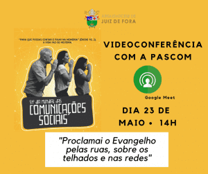 Em virtude do Dia Mundial das Comunicações Sociais, a Arquidiocese promoverá neste sábado (23), a partir das 14h, uma videoconferência com todos agentes da Pastoral da Comunicação (PASCOM). Será um momento de espiritualidade e reflexão sobre a atuação dos agentes da PASCOM neste período de pandemia da Covid-19.