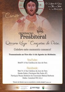 A Ordenação Presbiteral será transmitida ao vivo pelo YouTube da WebTV “A Voz Católica”, pela Rádio Catedral Juiz de Fora e pelas páginas no Facebook das paróquias São Pedro – onde Kayo exerceu o ministério diaconal – e Nossa Senhora da Conceição de Matias Barbosa (MG) – sua comunidade de origem.