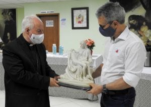 Após a rápida reunião, Dom Gil e Romeu Zema trocaram presentes entre si: o Arcebispo ofereceu ao governador uma imagem de Nossa Senhora da Piedade, padroeira de Minas Gerais, recebendo, em seguida, um conjunto de xícaras rústicas e um café tradicional do Estado.