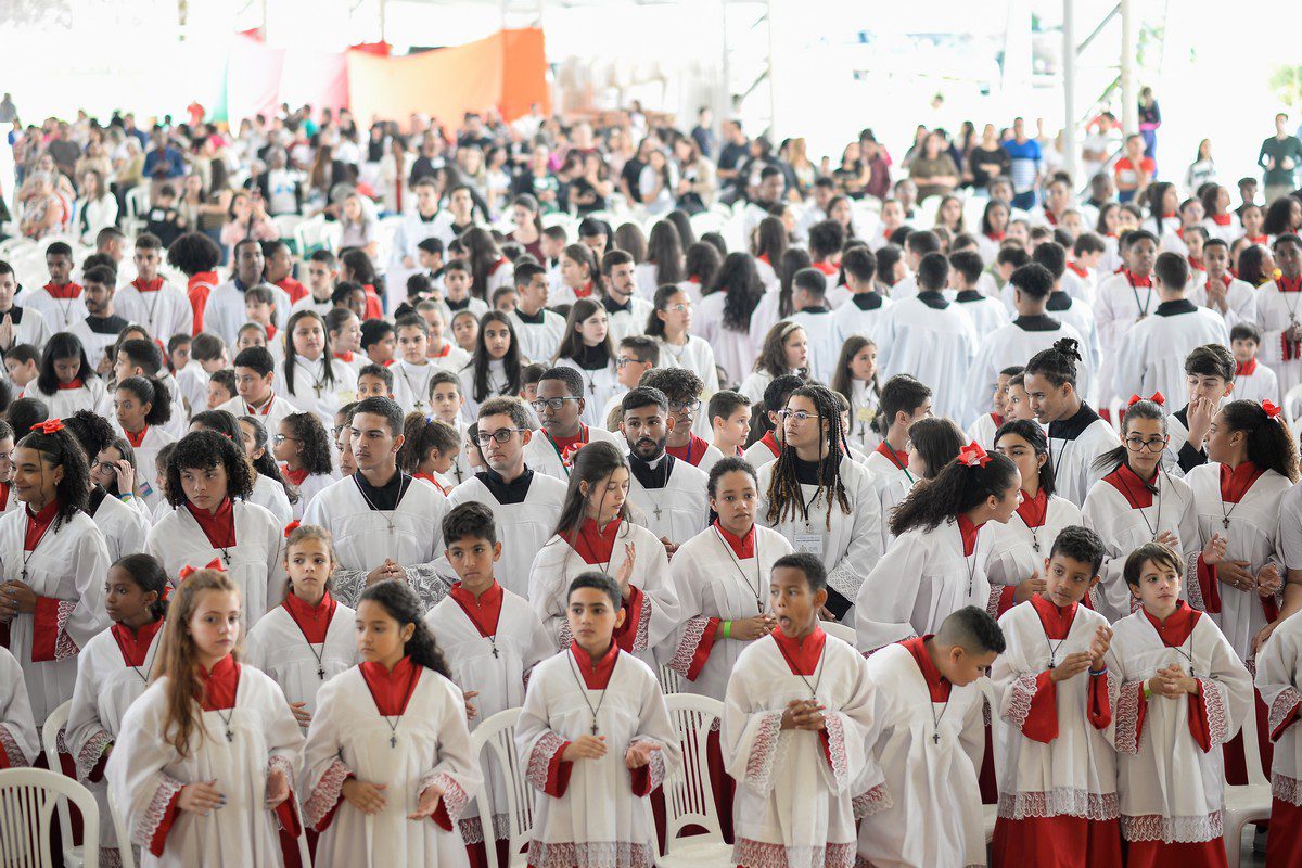 Nesta edição, inspirados do Ano Vocacional 2023 e pelo Ano Mariano, jovens de diversos locais se encontraram, trocaram experiência e rezaram juntos. “Hoje estiveram aqui presentes mais de 900 coroinhas e acólitos, que ainda não mostram a totalidade daqueles que servem ao altar em nossas paróquias, mas estão aqui para celebrar”, comentou o Assessor da Pastoral Vocacional, Padre Miguel Campos.