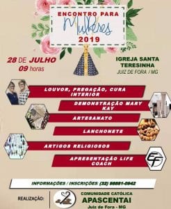 A Comunidade Católica Apascentai realizará, no dia 28 de julho, o Encontro para Mulheres, na Igreja Santa Teresinha, a partir das 9h. O tema deste ano é “Chame por mim e eu te responderei, anunciando coisas grandiosas!” (Jr 33,3).