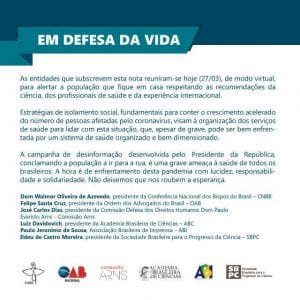 As entidades ainda explicam que a hora é de enfrentamento desta pandemia com lucidez, responsabilidade e solidariedade e alertam para o perigo da desinformação que parte do próprio poder público: “A campanha de desinformação desenvolvida pelo Presidente da República, conclamando a população a ir para a rua, é uma grave ameaça à saúde de todos os brasileiros”.