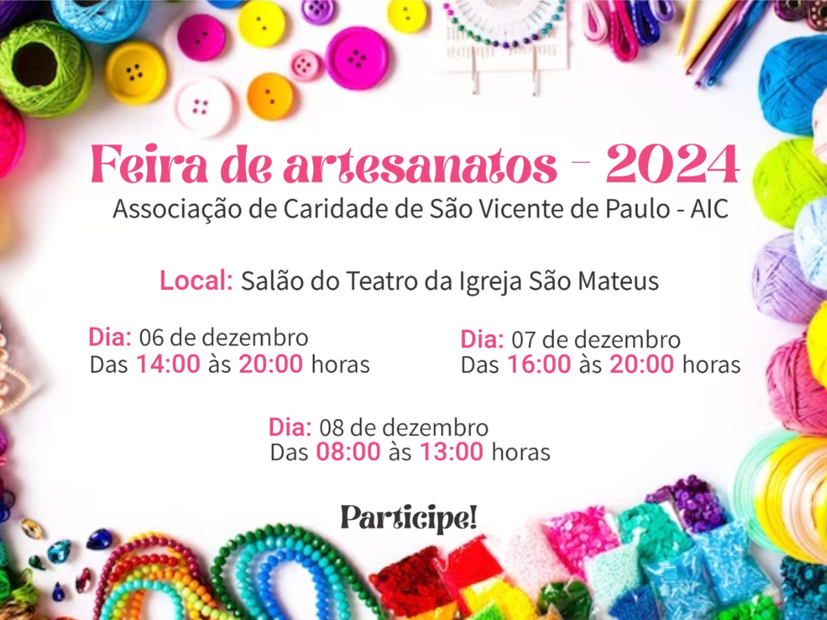 A Associação de Caridade São Vicente de Paulo (AIC), integrante da Família Vicentina, realiza neste fim de semana a Feira de Artesanato 2024. O evento tem o objetivo de arrecadar fundos para a compra de cestas básicas destinadas a famílias em situação de vulnerabilidade social. Ele ocorrerá no Salão do Teatro da Igreja São Mateus.
