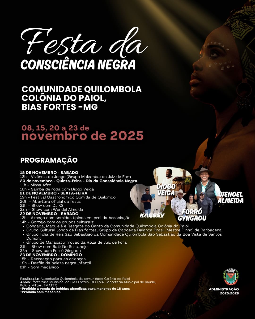 A cidade de Bias Fortes (MG) está realizando, nos dias 15, 20, 21, 22 e 23 de novembro, a festa da Consciência Negra. A comemoração ganha mais importância por promovida pela Associação Quilombola da Comunidade Colônia do Paiol. Trata-se de uma festa que une cultura, tradição e reconhecimento da cultura afro-brasileira. O evento contará com um momento religioso católico.
