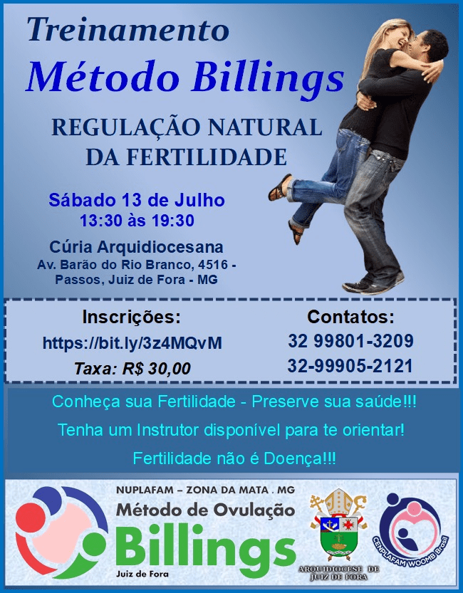 Estão abertas as inscrições para a formação de usuários no Método de Ovulação Billings (MOB), que preza pela regulação natural da fertilidade, sem o uso de dispositivos. O treinamento será realizado no dia 13 de julho, no prédio da Cúria Metropolitana, a partir das 13h30. O endereço é Av. Barão do Rio Branco, 4516 – Alto dos Passos.