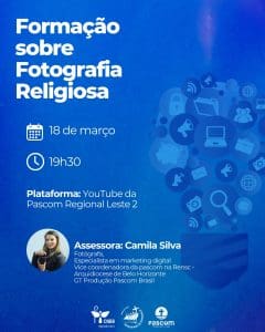 A Pastoral da Comunicação (Pascom) do Regional Leste 2 promoverá uma formação sobre fotografia religiosa no dia 18 de março, terça-feira, às 19h30, pelo seu canal no YouTube.