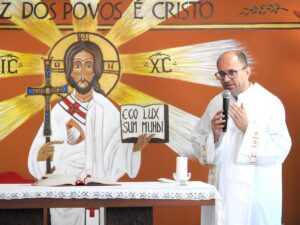 Durante sua homilia, Dom Gil explicou o motivo daquela celebração. “Primeiramente, porque este é o momento mais sublime da Igreja, mais sublime da fé cristã; não há nenhuma festa maior no calendário cristão do que a Páscoa. E vocês são funcionários desta casa. Esta casa, tudo o que existe aqui, os organismos, existem para servir ao Senhor Ressuscitado: é para Ele que nós trabalhamos, é para Ele que nós dedicamos tempo, atenção e alegria no trabalho. Então, é muito justo que nós nos reunamos para celebrar a pessoa d’Ele, de Jesus Ressuscitado, Aquele que é o motivo da nossa vida e é o motivo do nosso trabalho.”