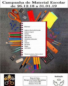 É possível contribuir com qualquer tipo de material, principalmente, caderno brochura grande, lápis, lápis de cor e canetinhas hidrocor. A coleta acontece até dia 31 de janeiro. As doações podem ser deixadas na recepção da Catedral, de segunda a sexta-feira, das 7h às 21h e no domingo das 08h às 11h ou das 15h às 20h. A recepção da Catedral fica na Rua Santo Antônio, 1201 – Centro.