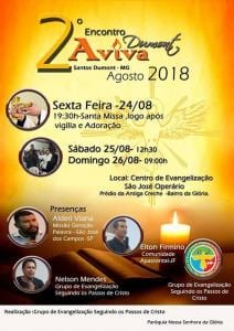 De 24 a 26 de agosto, o Grupo de Evangelização Seguindo os Passos de Cristo (SPC), de Santos Dumont (MG), promove a segunda edição do “Encontro Aviva Dumont”. O evento é aberto a todos os públicos, gratuito, e para participar não há necessidade de fazer inscrição.