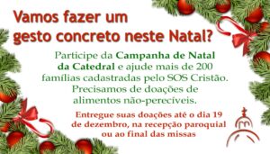 A partilha tornou-se um gesto concreto e o desejo de fazer o fim de ano de cerca de 200 famílias necessitadas, cadastradas na paróquia, uma data ainda mais especial também. Por isso, durante o mês de dezembro, a Catedral realiza, por meio do SOS Cristão, a Campanha de Natal, com a expectativa de arrecadar alimentos não-perecíveis.